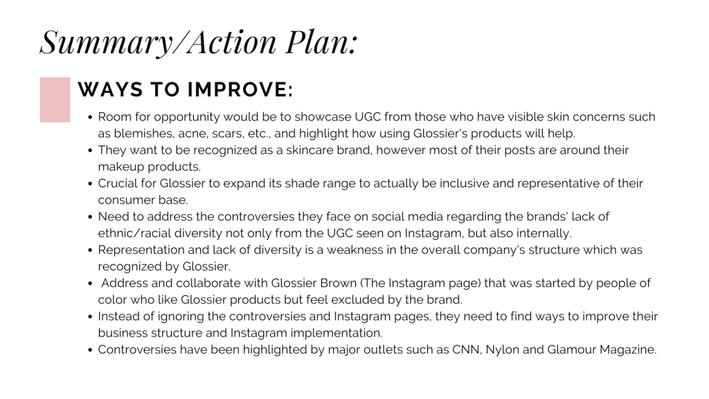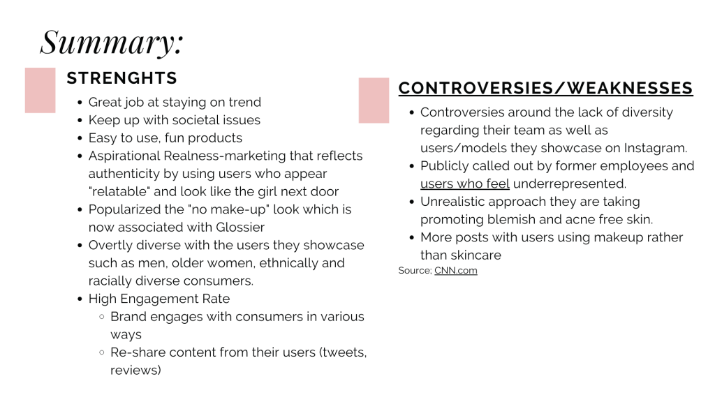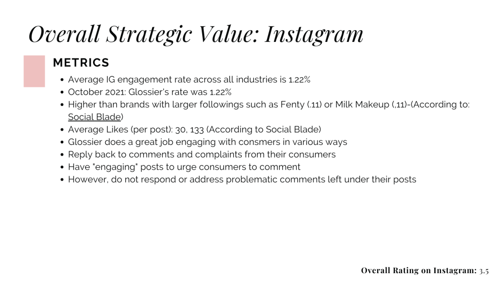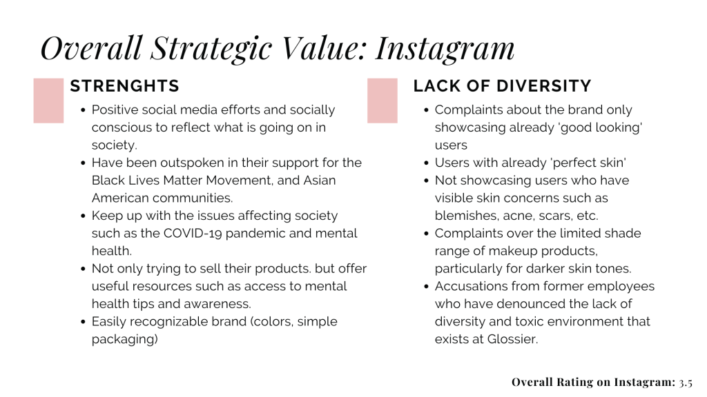 For my Introduction to Digital Social Media course at USC, I analyzed the Instagram implementation of the direct-to-consumer cosmetics brand Glossier. On a scale from 1 to 5 (5 being the best), I analyzed Glossier’s overall aesthetic, brand/voice, engagement efforts, inclusion, diversity and accessibility. I summarized Glossier’s strengths, weaknesses, and its overall presence on Instagram. Please refer to the following document to learn more about my findings.